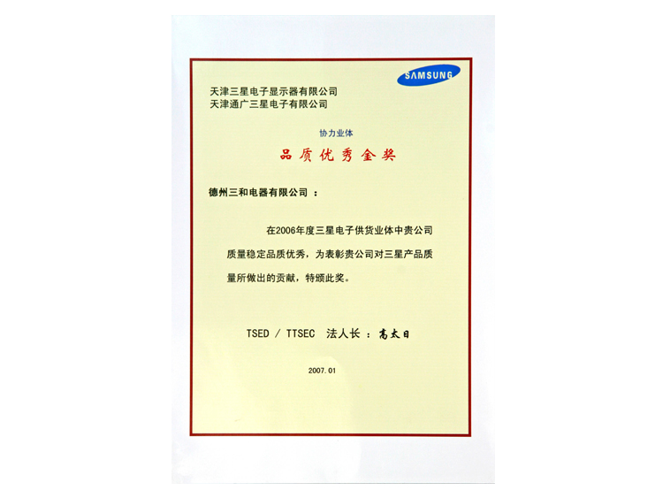 三星金獎(jiǎng)證書(shū)